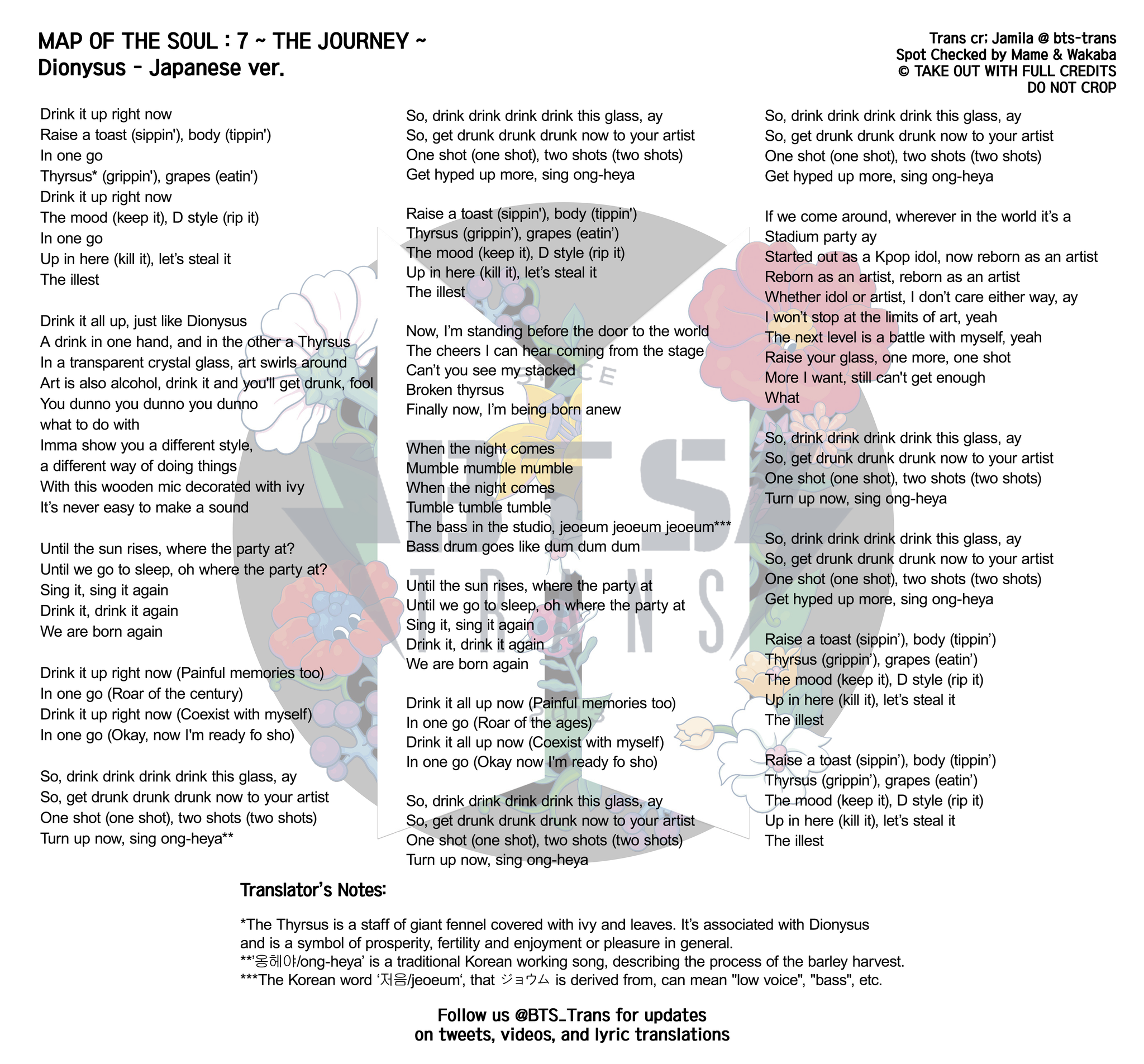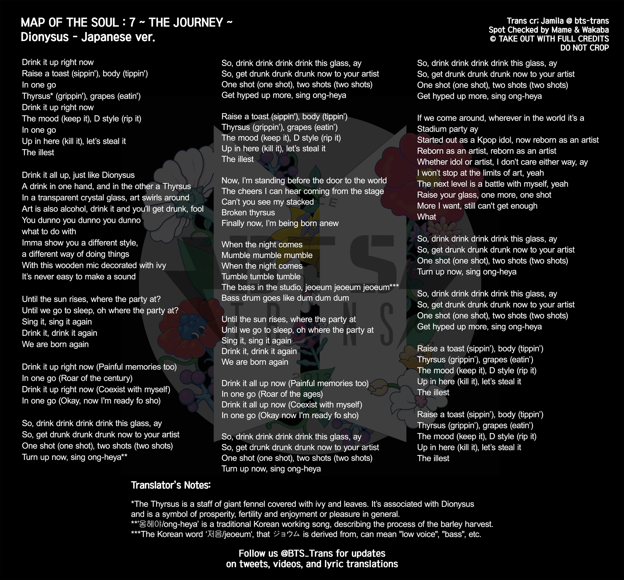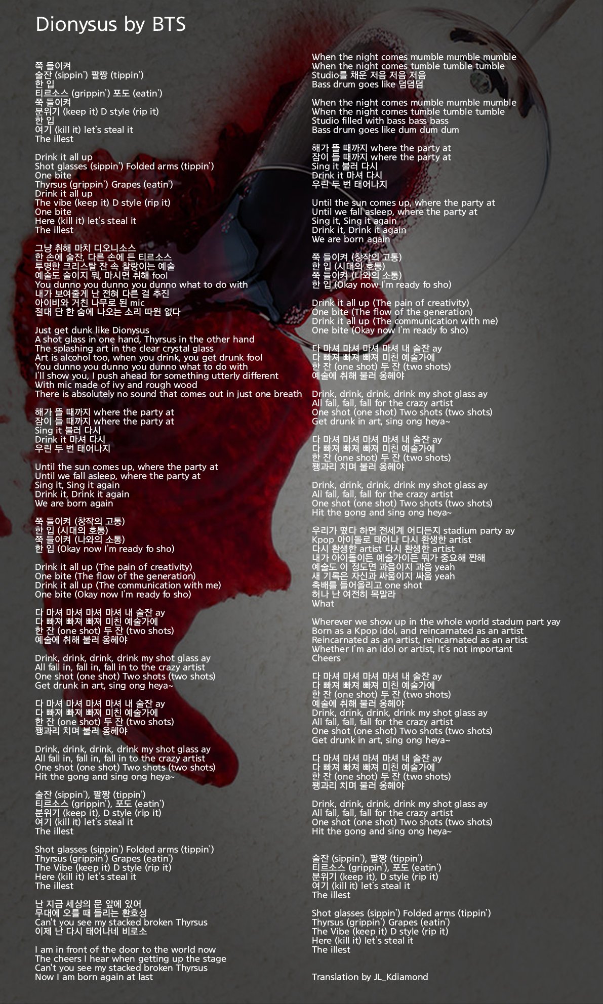 Find more of BTS lyrics. This heavy hip-hop track finds BTS comparing the feeling of getting inebriated to their creative processes and artistry. Dionysus is the Greek god of wine who was associated with debauchery and excess.